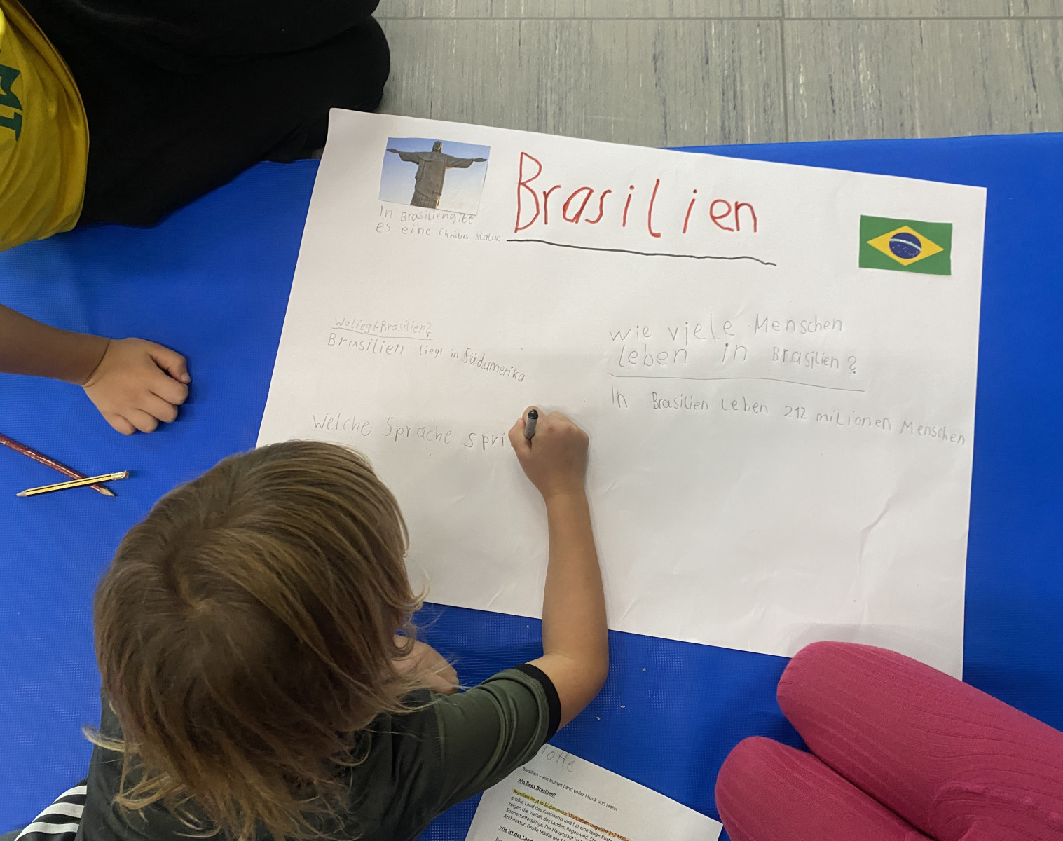 Anderen Kulturen auf der Spur: Am Leseprojekttag hat sich die Klasse 3c mit verschiedenen Ländern auseinandergesetzt. Zuerst wurden Texte gelesen, Bücher durchstöbert und am iPad recherchiert, um in der Gruppe möglichst viele Informationen über die Länder Nigeria, Philippinen, Brasilien und Peru zu sammeln. Anschließend haben die Kinder in ihren Gruppen Plakate erstellt, sie den anderen Kindern präsentiert und sich gegenseitig Rückmeldung gegeben. Nach der Vorstellung aller Plakate haben die Gruppen ein für ihr Land typisches Sportspiel vorgestellt und selbstständig mit den anderen Kindern durchgeführt. So haben alle auch einen Eindruck davon gewinnen können, welche Spiele im Sportunterricht in anderen Ländern gespielt werden.