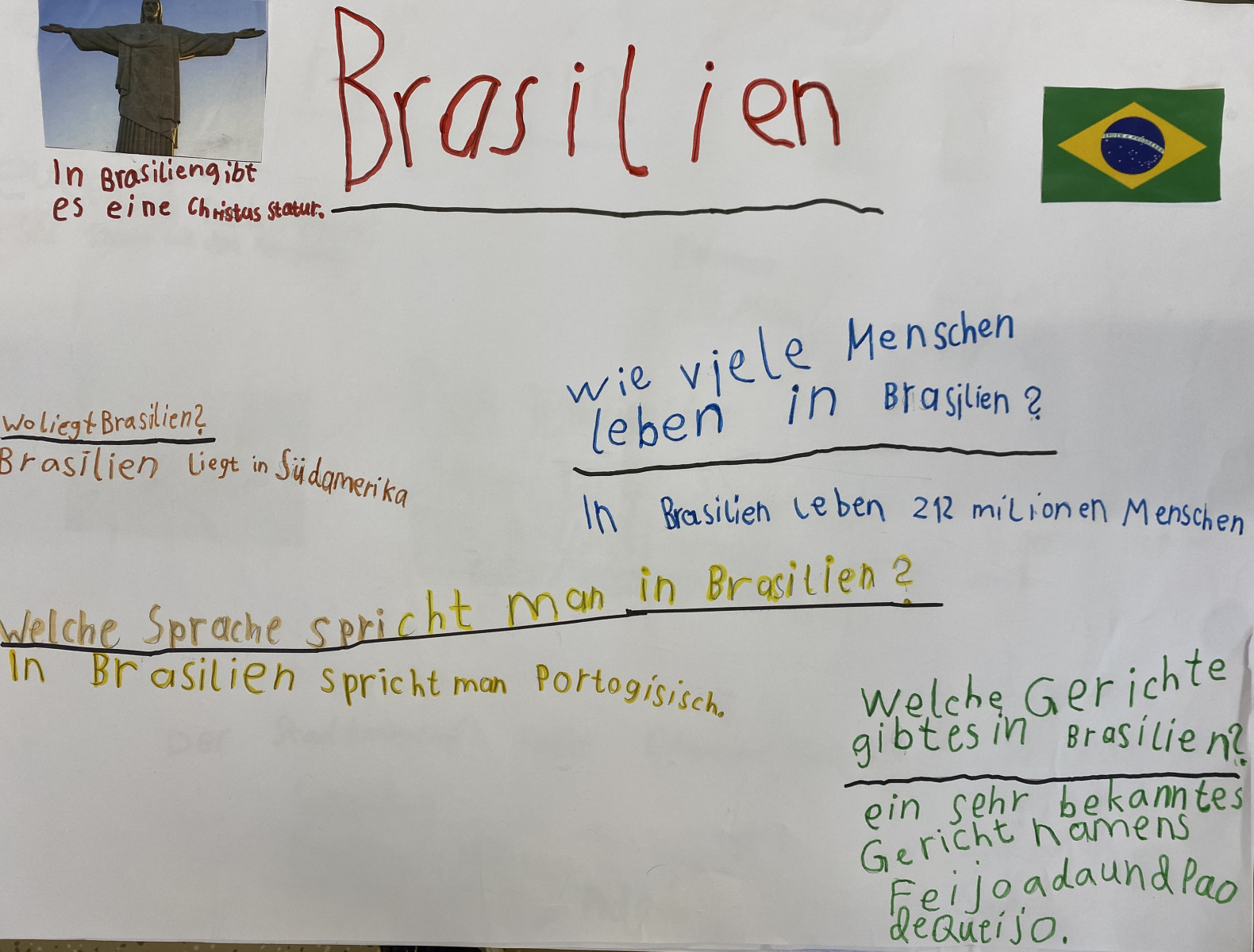 Anderen Kulturen auf der Spur: Am Leseprojekttag hat sich die Klasse 3c mit verschiedenen Ländern auseinandergesetzt. Zuerst wurden Texte gelesen, Bücher durchstöbert und am iPad recherchiert, um in der Gruppe möglichst viele Informationen über die Länder Nigeria, Philippinen, Brasilien und Peru zu sammeln. Anschließend haben die Kinder in ihren Gruppen Plakate erstellt, sie den anderen Kindern präsentiert und sich gegenseitig Rückmeldung gegeben. Nach der Vorstellung aller Plakate haben die Gruppen ein für ihr Land typisches Sportspiel vorgestellt und selbstständig mit den anderen Kindern durchgeführt. So haben alle auch einen Eindruck davon gewinnen können, welche Spiele im Sportunterricht in anderen Ländern gespielt werden.
